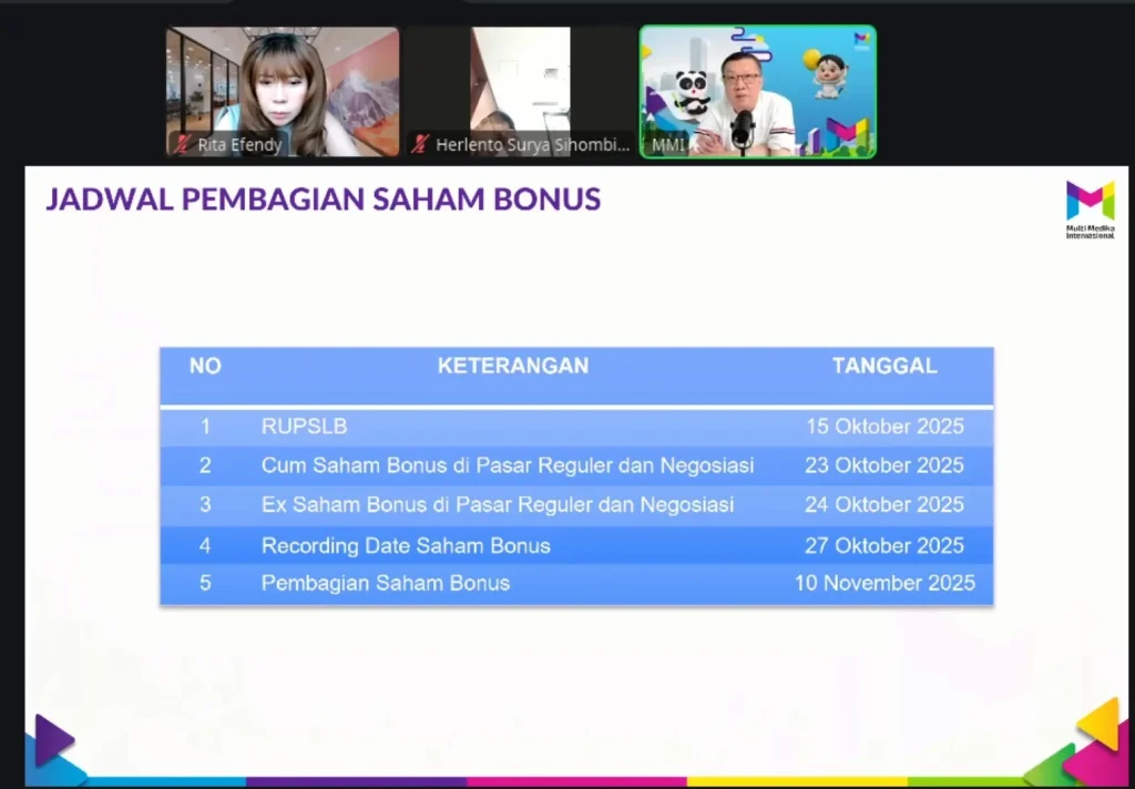 PT Multi Medika Internasional Tbk (MMIX) kembali mencatatkan langkah penting dalam perjalanan pasca-IPO dengan mengumumkan rencana pembagian saham bonus dengan rasio 1:1. Untuk memperluas pemahaman investor publik, perseroan menggelar Webinar Saham Bonus yang menghadirkan Rita Efendy, Investor Consultant sekaligus Founder Indonesia Investment Forum (IIF), sebagai pembicara tamu.